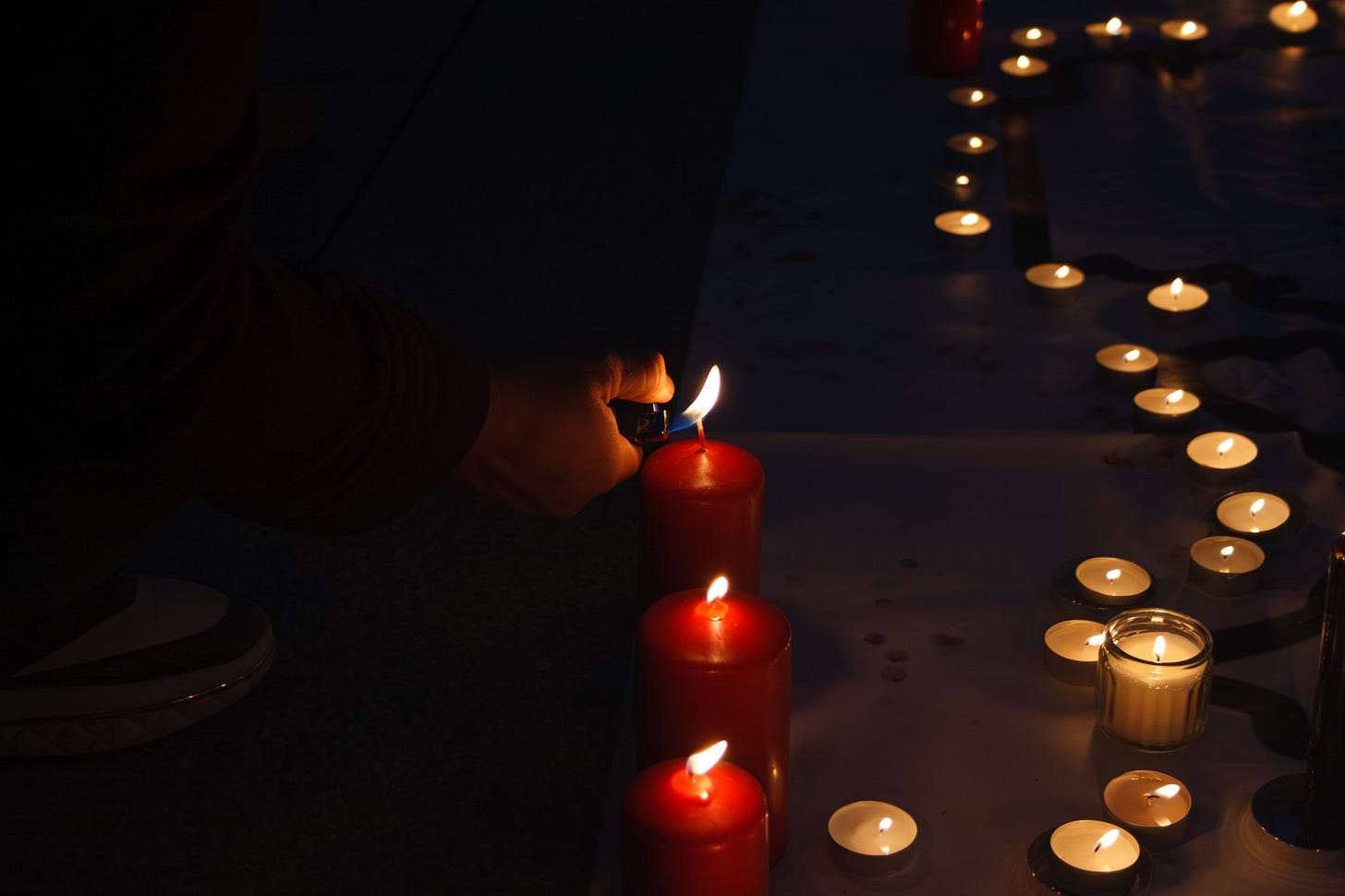 The idea was not to prove that you can still work “well” with an old body, but to turn those very limits into a complete exercise, technical, compositional and narrative. Technically, the constraint was clear, use the candles as the only truly meaningful light source, balance shutter speed and aperture to preserve the breath of the scene without falling into uncontrolled blur. Compositionally, it meant searching for lines and rhythm within human disorder: the perimeter of lights tracing a country’s borders, hands entering and leaving the frame to light, adjust, protect the flames from the wind, the flag suddenly cutting across the marble façade.