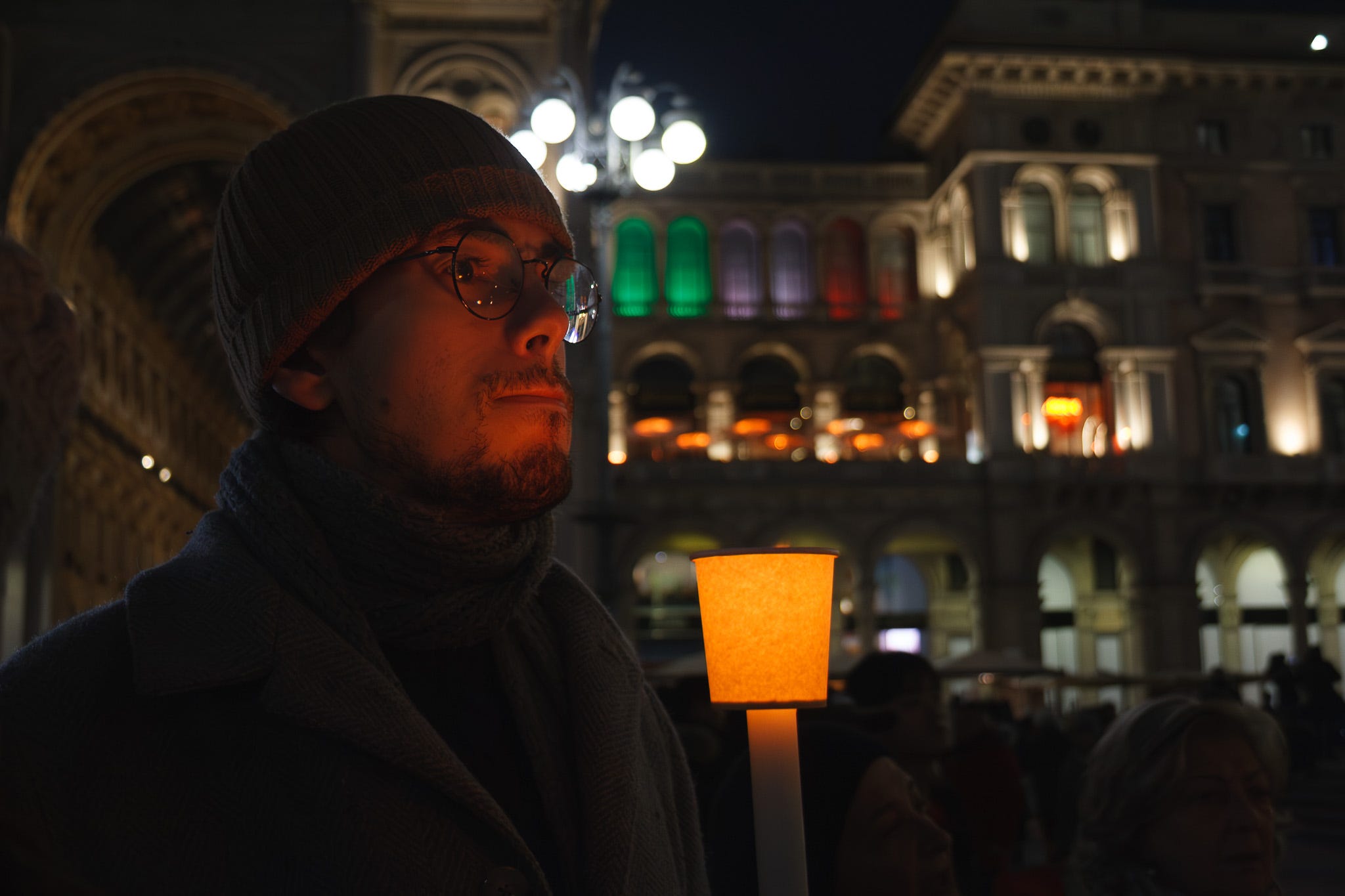 Le immagini di quella sera, messe in fila, sono pensate come una piccola traiettoria dentro la piazza. Si parte dall’alto, dal tappeto di candele che disegna il contorno di un paese lontano, per poi scendere sempre più vicino: le persone che lo circondano, i volti appena accennati alla luce dei lumini, le mani che accendono, sistemano, proteggono, la bandiera che si sovrappone al Duomo e riempie il cielo scuro. La sequenza non è solo un modo per “far vedere” l’evento a chi non c’era; è il tentativo di restituire la sensazione di essere stati in mezzo a quel cerchio di luce fragile, con una macchina fotografica che non perdona le distrazioni ma che, proprio per questo, ti costringe a stare davvero lì.